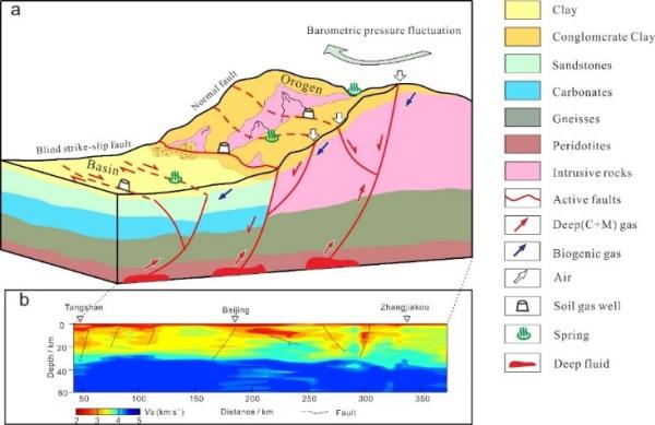 目前我国的深井构造地球化学观测研究的主要对象为温泉,已有观测和研究的区域覆盖了川滇、天山、华北、东北和鄂尔多斯西缘等地区。主要通过野外流动采样的方式周期性采集温泉点的气样和水样(图4),经室内分析测试获取温泉点的元素地球化学和同位素地球化学观测值,并分析计算地震重点危险区活动断裂带不同段流体的深部物质来源及其贡献率,评估活动断裂带不同段断裂的切割深度及闭锁程度,捕捉活动断裂带深部流体地球化学地震前兆信息,探究深部流体在地震孕育和发生过程中的关键作用,并建立模型(图5)。