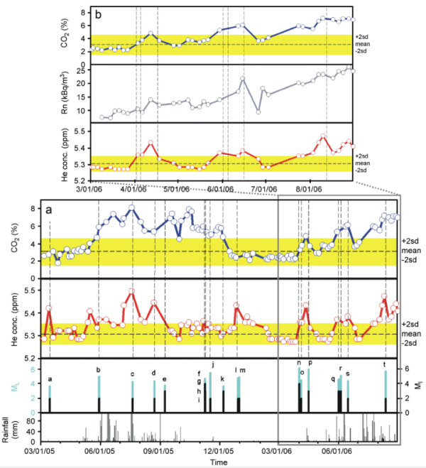 相比国外同行,我国虽然在构造地球化学领域起步较晚,但是我国在构造地球化学观测和研究方面,具有规模大、成果卓越的显著优势。比如,我国台湾在构造带流体地球化学方面就走在了世界的前沿,已建立完善的构造地球化学观测体系,并基于观测结果,在台湾近几年的几次中强地震前提出了有效预测意见(图2)。