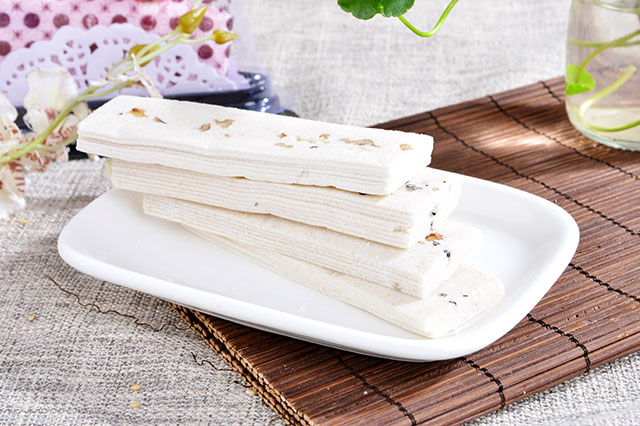 如皋董糖是是江苏如皋十大特色小吃,属于苏式糕点,据说是明末如皋名士冒辟疆的爱妾董小宛所造。董糖以精白面、白糖、芝麻、饴糖为原料,经选料、熬糖、制糖芯、制糖骨、成型等工序而成,成品为扁长方体,色白微黄,层次分明,剖面可旋状纹理,中心呈丹凤眼状,宛若娇俏女子的眼睛,深受本地人和游客的喜爱。如皋董糖一口下去软糯糯、甜蜜蜜,又带着点劲道,再配上芝麻的酥脆、核桃的焦香、果汁的清新,入口易化,酥松香甜,口味纯正,食之齿颊留香,回味久长。 【 详细>>】