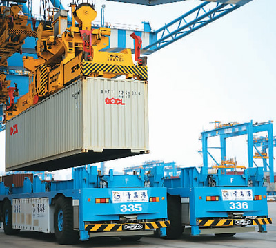 4月17日,在山东青岛港全自动化码头,自动导引车来回穿梭运送出口的集装箱。