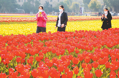 3月18日,江苏苏州吴江区新湖明珠城郁金香公园内的50万株郁金香美丽绽放,吸引游人前来欣赏。