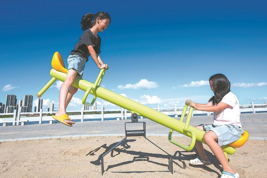 两个小姑娘在公园的跷跷板上玩得很开心。村容村貌改善了,让丙洲更加宜居。