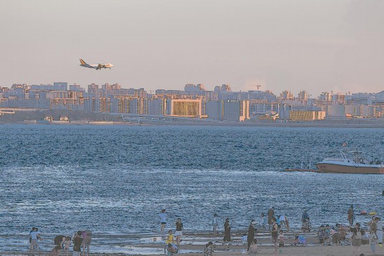游客在后田海滩上玩耍,对岸的厦门岛上一架航班正在起飞。