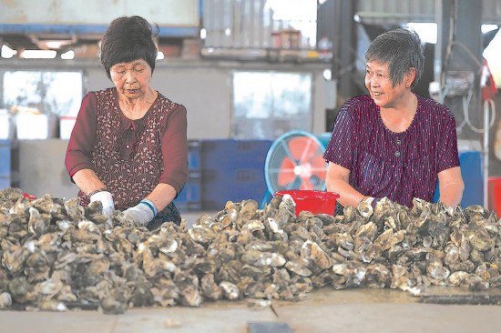 村民在开海蛎。海蛎集散市场的存在,解决了潘涂富余劳动力的就业难题。
