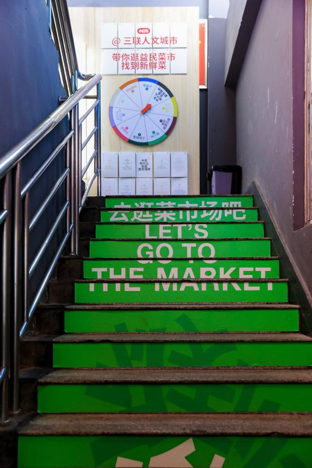 益民菜市长顺街店地处二楼,共有四个通往上行的交通空间。在展览期间,这是顾客出入菜市场的必经之路,灯箱、霓虹灯等城市招牌形式的视觉装置完成了与顾客的初步互动体验。菜市场里的十字路口,设置了若干具有“路标”和“红绿灯”意象的交通路牌,用于帮助顾客快速找到想购买的菜品。