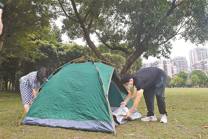 去年年底,深圳市、区22家公园划定帐篷区,市民的假期休闲方式多了一种选择,那就是去公园露营。一顶帐篷,一个野餐垫,摆上各色零食餐点饮料,有的市民还把帐篷精心装饰,露营、拍美图两不误,在都市里也能享受浪漫的田园生活。“露营热”席卷,许多市民都兴致满满地体验这场公园游玩“新时尚”。随着越来越多的人加入露营,有的人在公园支起了大型天幕等,占地面积大不说,还有安全风险。