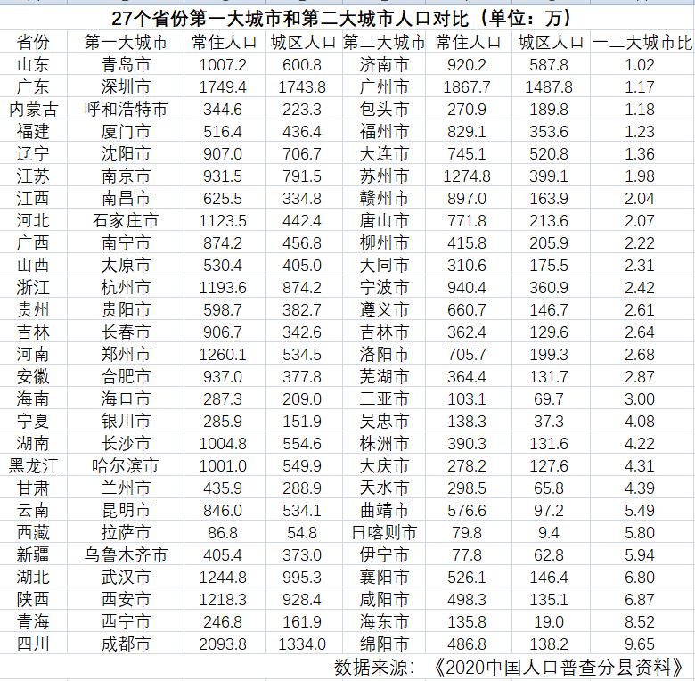直辖市以外的27个省份中,城区人口第一大城市都是谁?第一大城市与第二大城市之间差距如何?