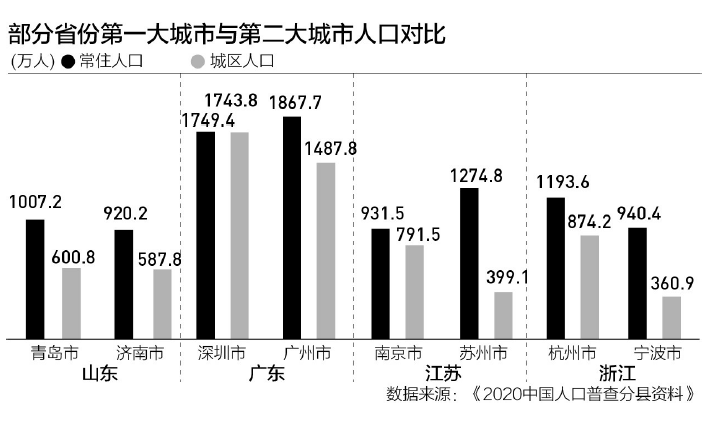 第一财经记者根据《2020中国人口普查分县资料》梳理发现,有24个省会城市城区人口规模位居所在省份第一,只有3个非省会城市城区人口规模超过了省会城市。在中西部不少省份中,第一大城市与第二大城市的城区人口规模差距较大。而在东部沿海地区,这一差距相对较小。
