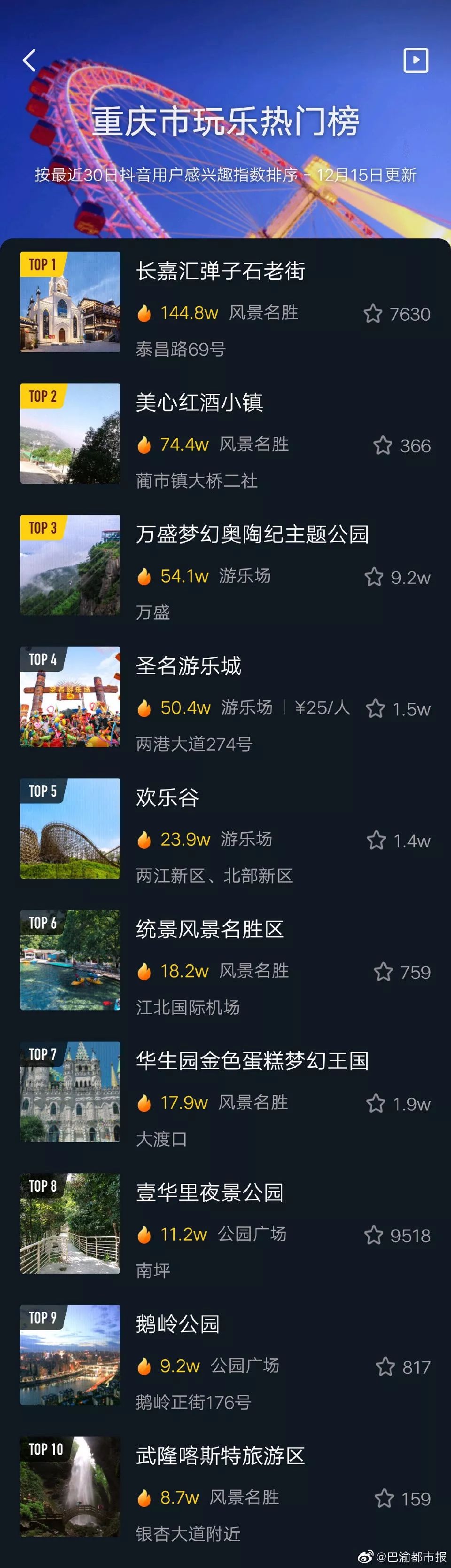 最近抖音新鲜出炉了“重庆市玩乐热门榜”