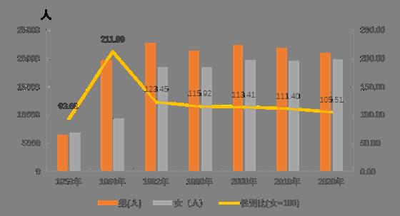 全县常住人口[2]中,男性人口为20906人,占51.34%;女性人口为19814人,占48.66%。总人口性别比(以女性为100,男性对女性的比例)为105.51,比2010年第六次全国人口普查时下降 5.89。
