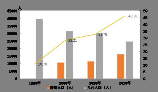 图6-1 近四次人口普查分城乡常住人口及城镇化率