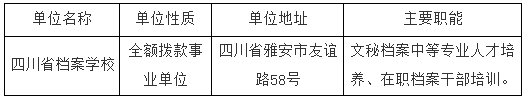 根据《事业单位人事管理条例》、《事业单位公开招聘人员暂行规定》和《四川省省属事业单位公开招聘工作人员实施细则(试行)》等有关规定,四川省档案局拟面向社会公开招聘部分工作人员补充到直属事业单位四川省档案学校工作。现将公开招聘有关事项公告如下(本公告由省档案局同时在四川人事考试网[,下同]和四川省档案局网[,下同])上发布。
