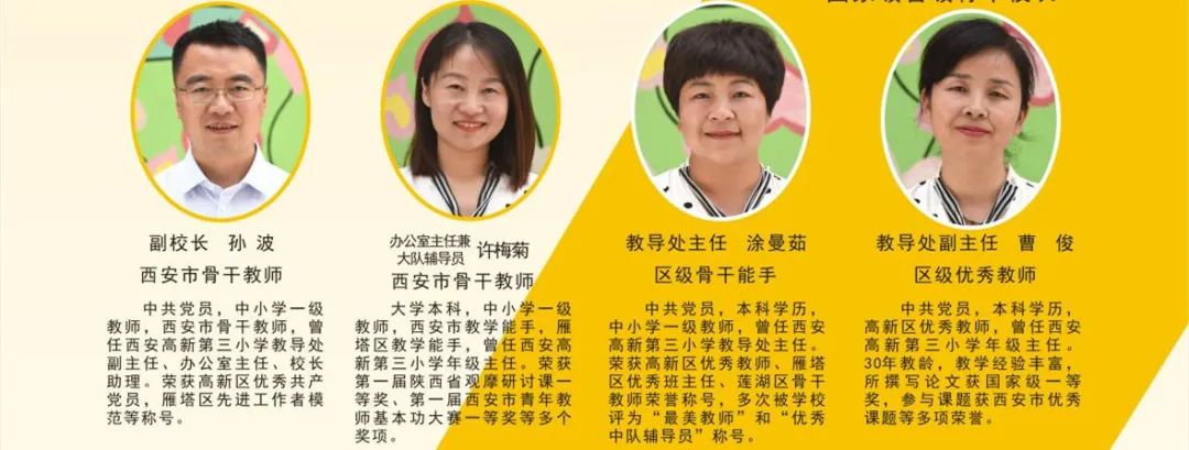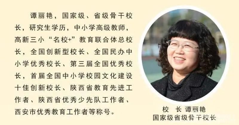 西安高新第十四小学校长谭丽艳,国家级、省级骨干校长,陕西师范大学教育管理研究生毕业,从教39年,党龄34年,担任校长24年,曾创建并担任西安高新第三、第四小学校长,现任西安高新第三小学“名校+”教育联合体总校长兼党支部书记。