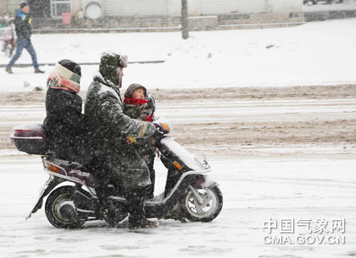 河南省平顶山市宝丰县市民冒雪骑行街头。