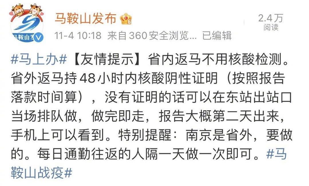 11月4日,安徽省马鞍山市委宣传部官方微博@马鞍山发布 发布一则“友情提示”:省内返马不用核酸检测。省外返马持48小时内核酸阴性证明(按照报告落款时间算),没有证明的话可以在东站出站口当场排队做,做完即走,报告大概第二天出来,手机上可以看到。微博中还特别提醒:“南京是省外,要做的。每日通勤往返的人隔一天做一次即可。”