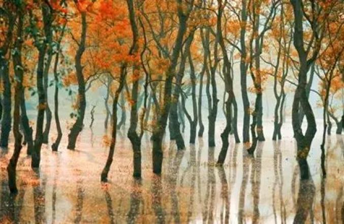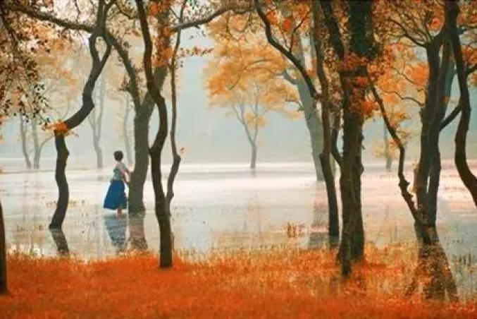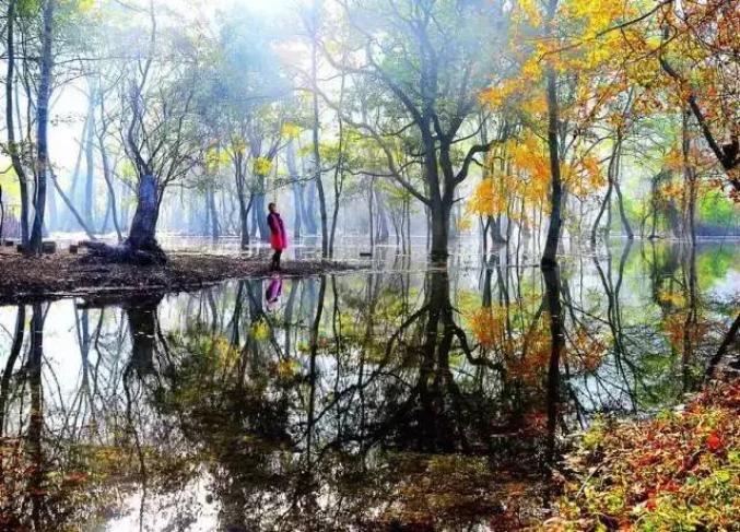 深秋的金滩古林,更是美得一塌糊涂,到处染上了点点橘色,碧绿的湖水静卧在两岸的红叶之中。