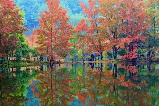 到了秋天,这里便成了一个缤纷的世界,绿如翡翠的湖水,和红如火焰的枫叶,瞬间就钩住了旅人的心魂。