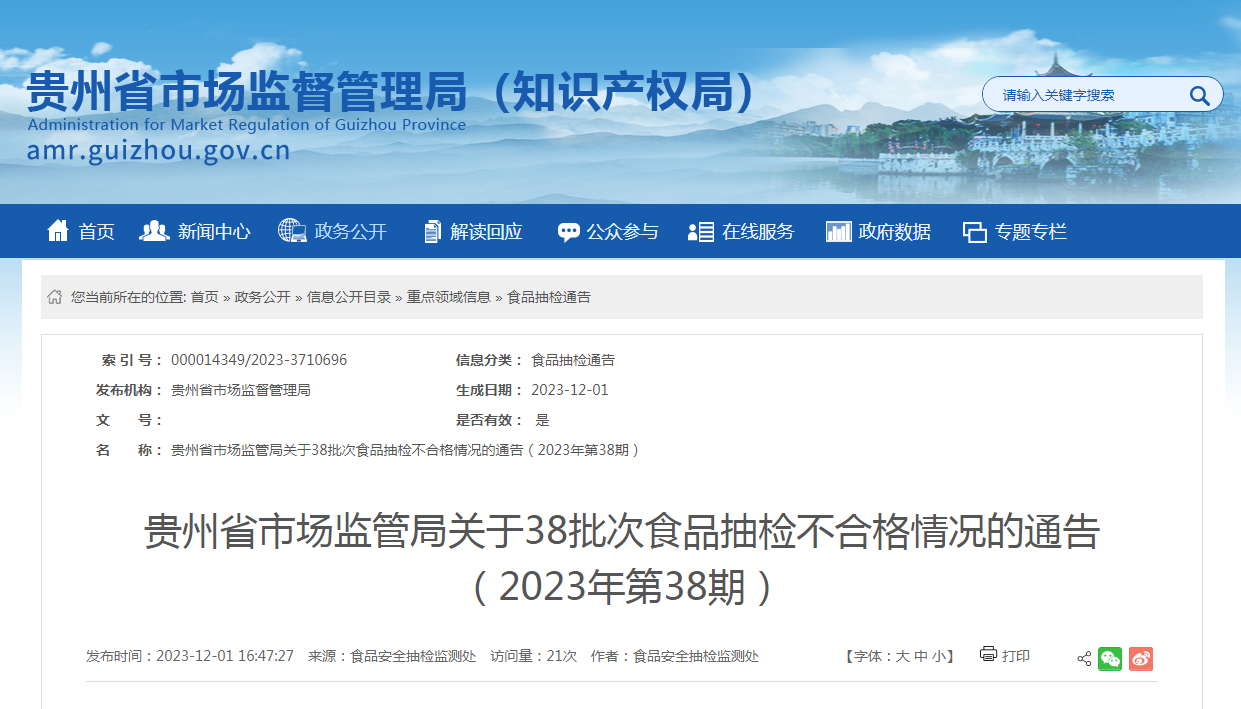 贵州省市场监管局关于38批次食品抽检不合格情况的通告(2023年第38期)