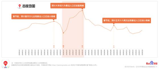 据《报告》显示,2020年春运人口迁徙整体趋势表现为,春节假期前全国人口迁徙逐步攀升,腊月廿七(1月21日)出现人口迁徙小高峰。随后人口迁徙逐步回落,除夕当天达到最低水平。紧接着,春节假期中迁徙逐步上升,最高峰预计出现在大年初六(1月30日)。春节假期后,全国人口迁徙逐步回落,但因部分人群正月十五过后才开始返程,预计正月十六(2月9日)将再次出现春运人口迁徙小高峰。