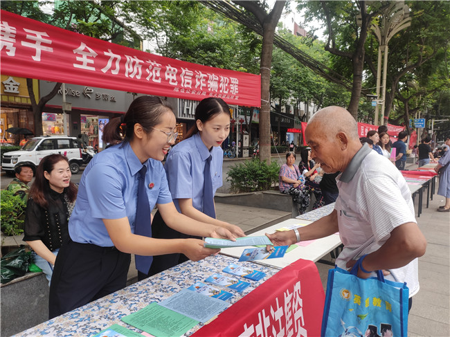近日,陕西省宝鸡市陈仓区检察院检察官来到金谷广场,开展防范非法集资、电信网络诈骗宣传活动,结合具体案例揭示电信网络诈骗的表现形式、常见手段、社会危害等,引导群众辨别和远离电信网络诈骗陷阱。本报通讯员杜永清 杜妙玲摄