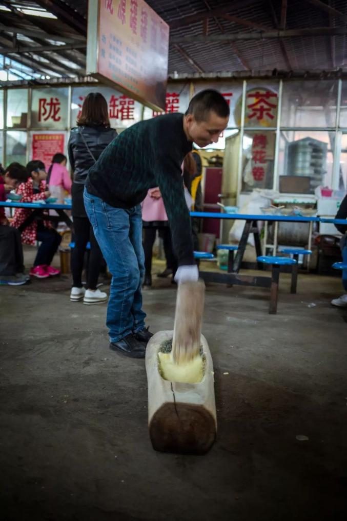 而洋芋(土豆)搅团,是在陇南更流行的款式,高原上的洋芋质地厚实,上锅蒸熟,就按在木槽里砸,口感比起软趴趴的土豆泥,要柔韧劲道得多,按流行语,吃了这一口,保你“支棱起来”。