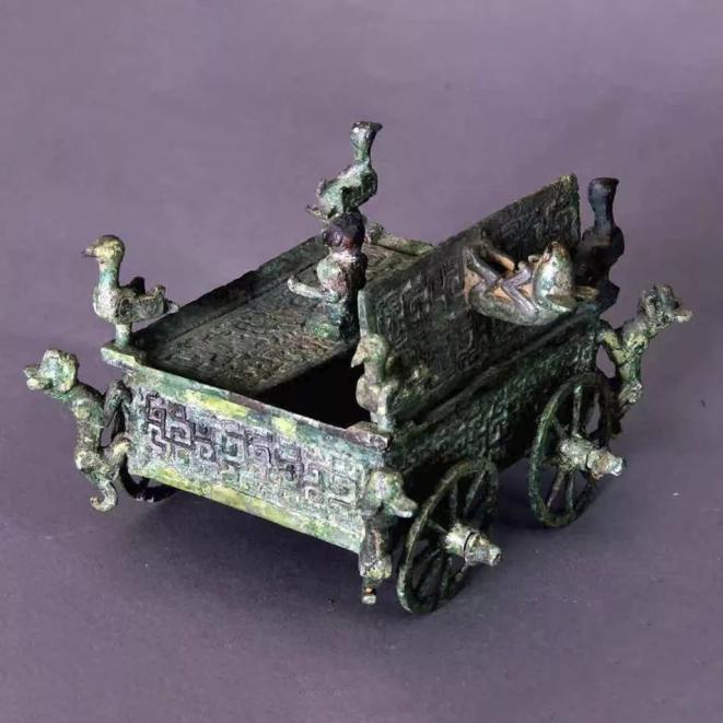 ▲ 图右 甘肃省秦文化博物馆镇馆之宝蟠虺纹车型器,可能是首饰盒或小型玩具或挽车用;图左 窃曲垂鳞纹鼎,是最常见的礼器之一。供图/礼县博物馆