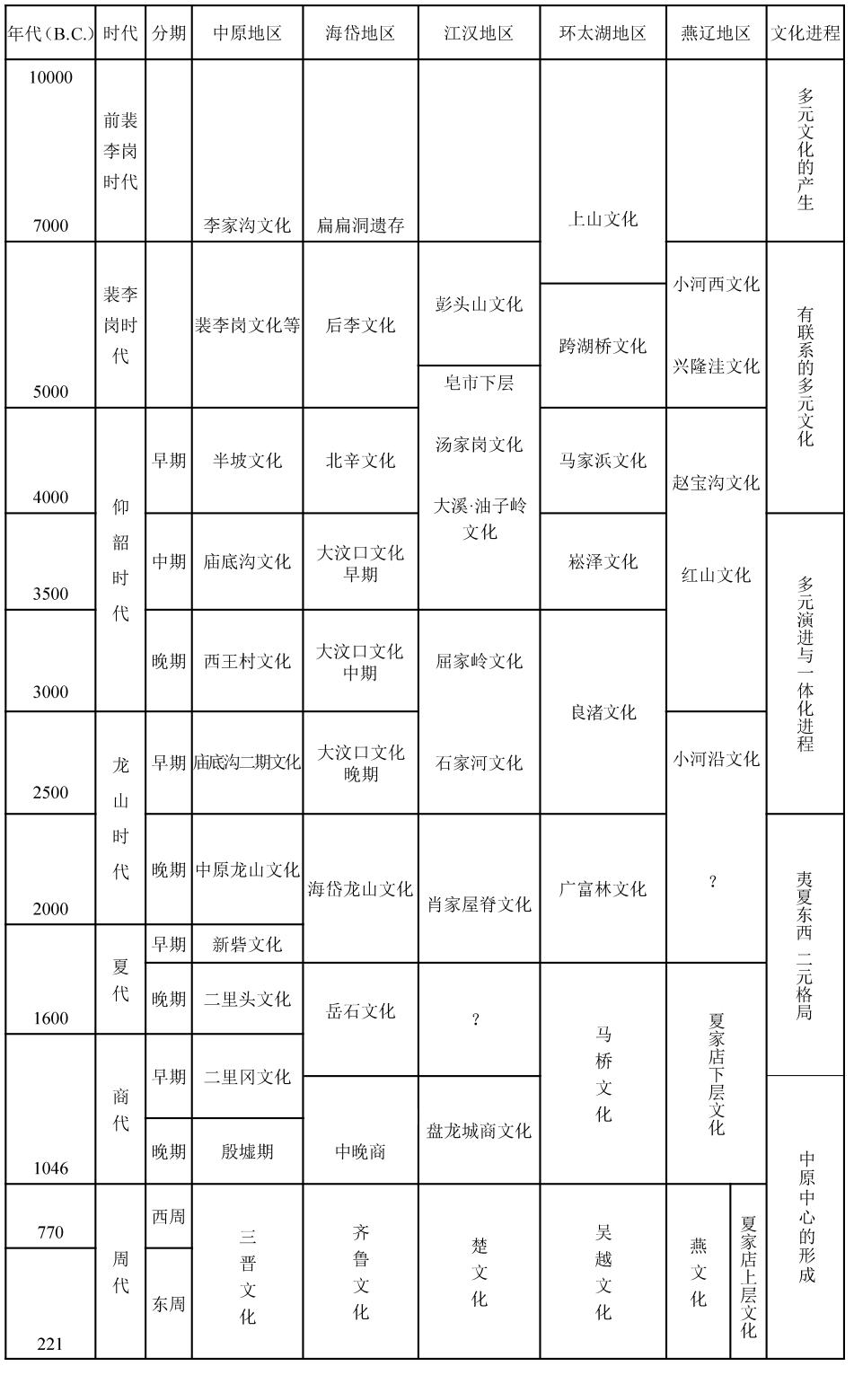 第一个层级主要有中原地区、海岱地区、江汉地区、环太湖地区和燕辽地区等五个大的文化区。这五个地区的基本特点是,新石器文化的发展谱系、文化序列比较完整和清楚,均从距今8000-9000年前后甚至更早的新石器时代早期开始,大体上呈现出连续和断裂交替的发展态势延续下来,最终与各区域的历史时期文化在年代上相连接。如中原地区与三晋,海岱地区与齐鲁,江汉地区与楚,环太湖地区与吴越,燕辽地区与燕,等等。新石器时代以来各大文化区系对历史时期文化的拖后影响清晰可见。现将上述五大区系考古学文化的发展和延续过程整理如下(参见表1):