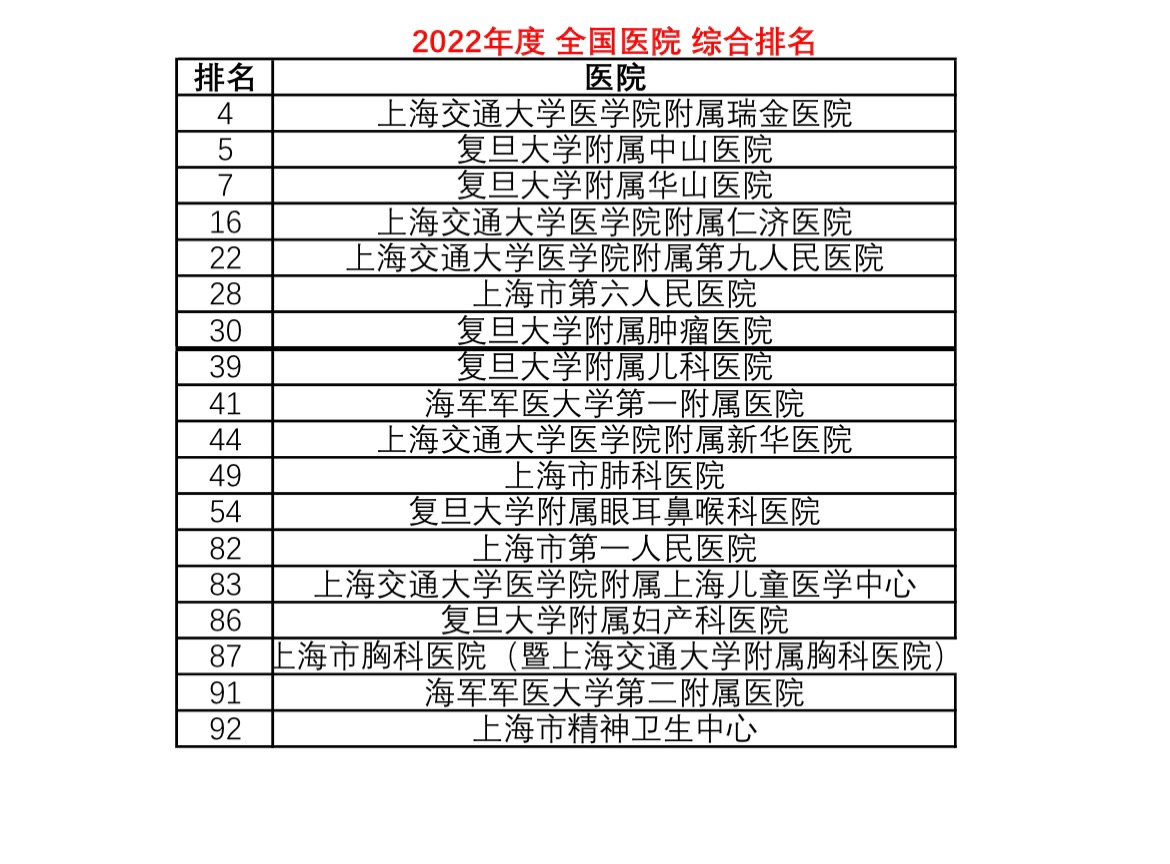 复旦版《2022年度中国医院综合排行榜》百强榜中的上海医院排名