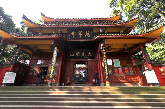 峨眉山核心景点万年寺是峨眉山八大重点寺庙之一,踞观心岭下,门迎大坪、牛心等寺和石笋、钵盂诸峰,海拔1020米,因供奉普贤铜像驰名,是峨眉山必游寺庙之一。万年寺布局十分精美,整座寺院坐西朝东,依次为山门、弥勒殿、砖殿、巍峨宝殿、大雄宝殿。此外,万年寺佛教文物十分丰富,寺内的珍藏文物品位极高,如佛像、“佛门三宝”(贝叶经、佛牙、御印)、法器、书画、匾对等等。 【 详细>>】