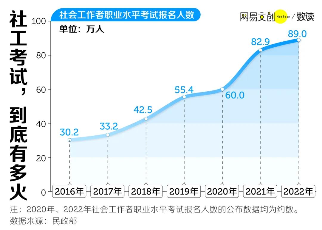 即便用处不大,人们考证傍身的野心却不小。从 2016 年到 2022 年,社工考试的报考人数就翻了不止一番。特别在 2021 年,报名人数直接上涨了 38.2%。