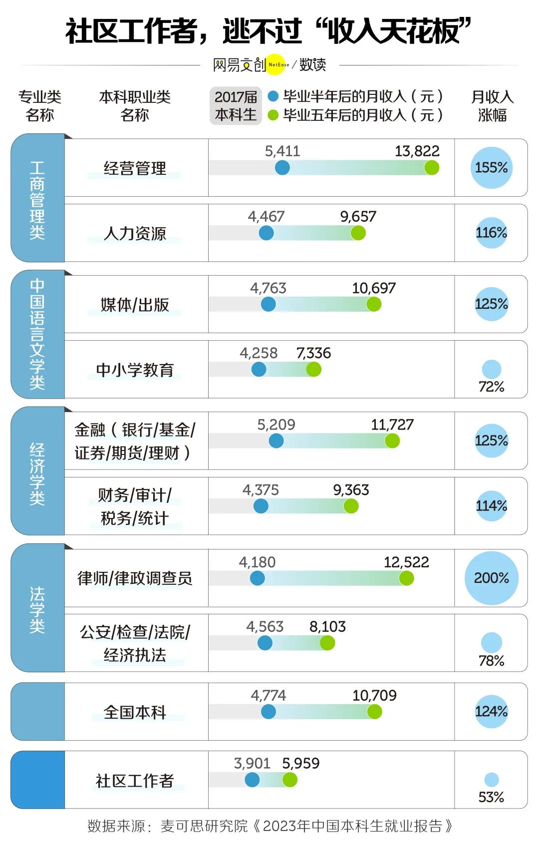 没前景的同时,社工还没有“钱景”。麦可思研究院的数据显示,从事社工的2017届本科生在毕业五年后月收入涨到了5959元,摆脱了月薪三千的魔咒,但涨幅却远低于全国本科生124%的平均数。