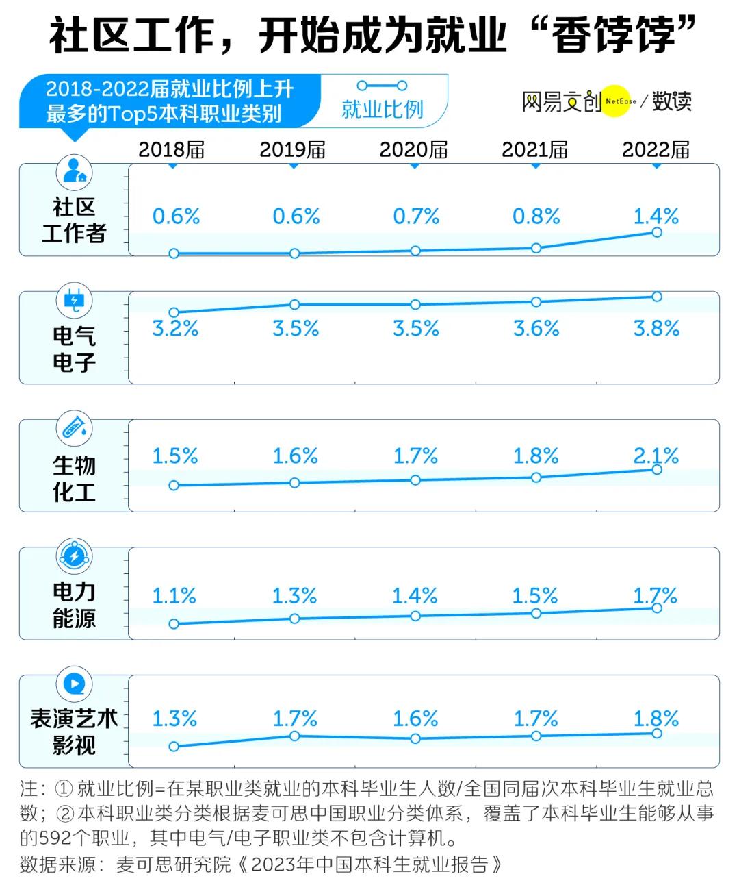 麦可思研究院发布的《2023年中国本科生就业报告》显示,从2018届到2022届,毕业后成为社区工作者的本科生越来越多,且五年来,从事社工的毕业生就业比例增速是48个职业类别里的Top 1。