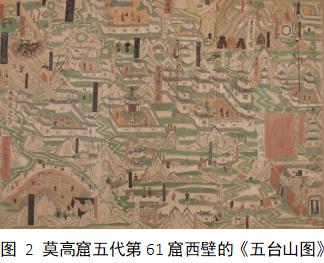 莫高窟壁画中,不仅有反映山川、河流等地理风貌的图画,而且还有形象的地理地形图,其中最著名的就是莫高窟五代第61窟西壁的《五台山图》。它是莫高窟壁画中现存的一幅最大的壁画,也是我国现存的最早的形象地图。这幅壁画高3.5米,长13.6米,面积47.6平方米,形象地描绘了十世纪后期,东起河北正定,西至山西太原,方圆250公里内的山河、地形、池沼、景物和社会风貌。图中山峦起伏,东、北、中、西、南五台并峙,各有一山环抱,山川道路交错纵横,城池村镇星罗棋布。其中还穿插了各种佛教感应故事、圣迹、瑞像、仙人赴会、高僧说法、信徒巡礼及商贾、行旅等人物活动,各色人物栩栩如生。图所描绘的驮运、铡草、推磨、舂米、担挑行路和迎来送往的人物等,真实地反映了当时社会生产活动和人民生活的图景。图中出现城郭、寺庙、亭阁、楼台、塔堡、草庐、店铺等各种历史建筑179处,桥梁13座,题榜清晰可辨的佛112方、菩萨20身、僧俗人物428身、乘骑驼马60多匹。它对五台山周围的城镇作了十分翔实的描绘。
