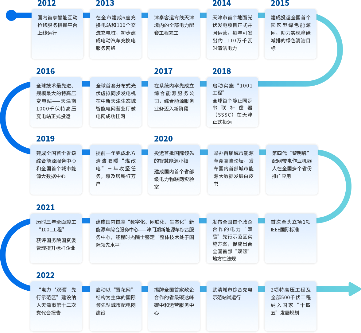 党的十八大以来,习近平总书记来津视察期间两次对电力工作作出重要指示,勉励“继续努力,再创新高”,在全国电网企业中是唯一一家。近年来,国网天津电力牢记总书记嘱托,深入学习贯彻党的十九大、十九届历次全会和党的二十大精神,努力在建设具有中国特色国际领先的能源互联网企业中“干在实处、走在前列”。历时三年建成“1001工程”,提前一年完成“煤改电”和农网改造升级,建成首批国际领先的10千伏“雪花网”试点,供电可靠性达到世界先进;打造全国首个政企合作的电力“双碳”先行示范区,建设集能源大数据中心、电力营商环境运营服务中心等十大功能于一体的电力双碳中心,挂牌天津碳达峰碳中和运营服务中心;配网带电作业机器人实现产业化突破、立项首个国际标准,建成国际领先的智慧能源小镇等一批示范,培育了“时代楷模”“改革先锋”“二十大代表”张黎明等一批重大典型;迭代推出“电十条”“双十条”“36项新举措”等服务措施,助力天津市连续两年获评全国营商环境标杆城市。公司党委获评中央企业先进基层党组织,公司获评国务院国资委“创建世界一流示范企业”管理标杆,入选国企改革三年行动典型案例集,首获国家技能人才培育突出贡献单位。