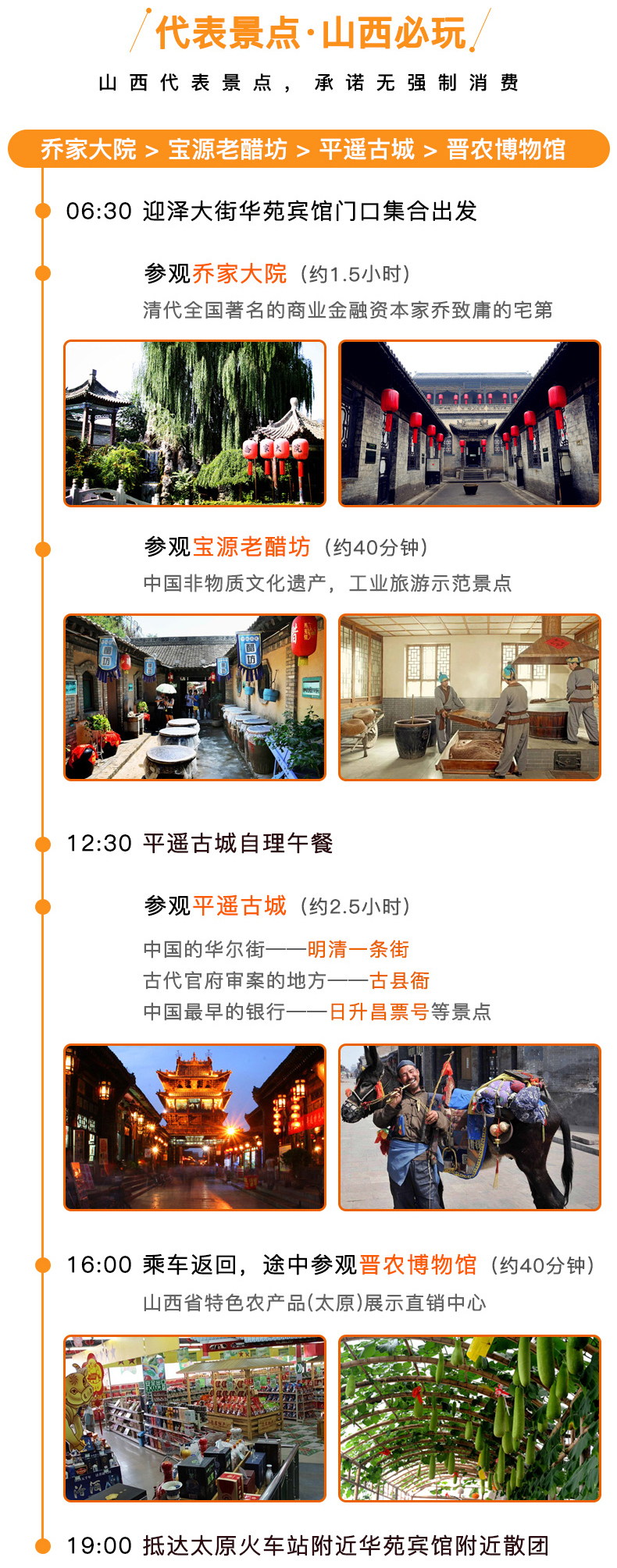 3. 门票:乔家大院、平遥古城门票(团队票,需跟团参观);