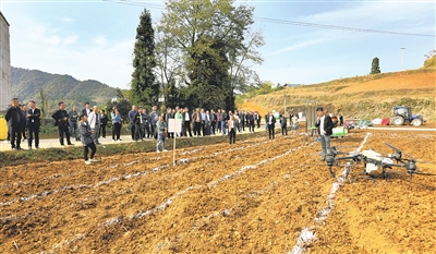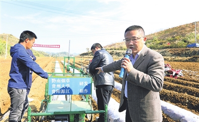 位于瓮安县瓮水街道办事处花竹山烤烟秋种现场点,大型拖拉机正在翻犁土地,植保无人机、自走式水肥一体机、起垄覆膜机、井窖打孔投苗移栽机、田园管理机、烟杆清理机、自动播种机等等针对烤烟生产各环节设计的各种农机具,整整齐齐地摆放在田间,让人应接不暇。工作人员一边介绍每一款机具的性能,一边熟练地操作演示,让前来观摩的代表发出阵阵赞叹。