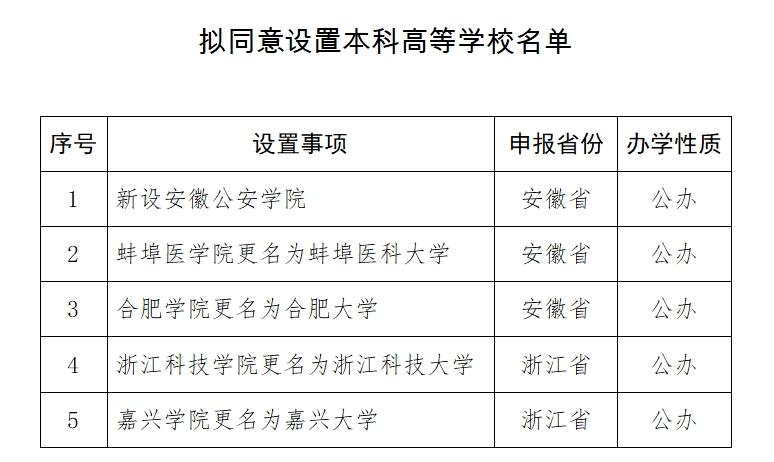 日前,教育部发展规划司发布公告称,拟同意合肥学院更名为合肥大学,浙江科技学院更名为浙江科技大学,嘉兴学院更名为嘉兴大学等。