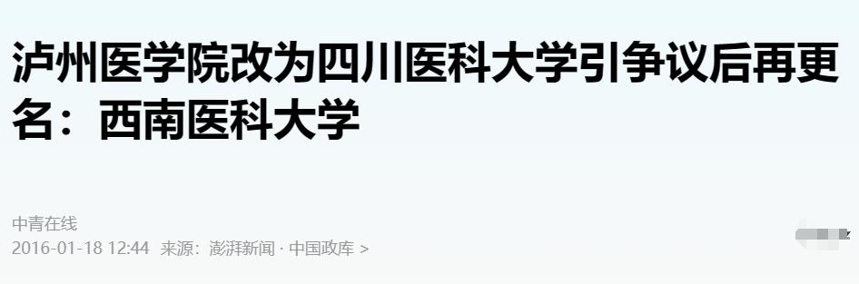 泸州医学院,最早寻求更名为“四川医科大学”,却因简称近似,而遭到四川大学华西医学院(川医)的反对,即使获得教育部批复,且新校门、新校徽都已正式出炉,但最终仍不了了之。