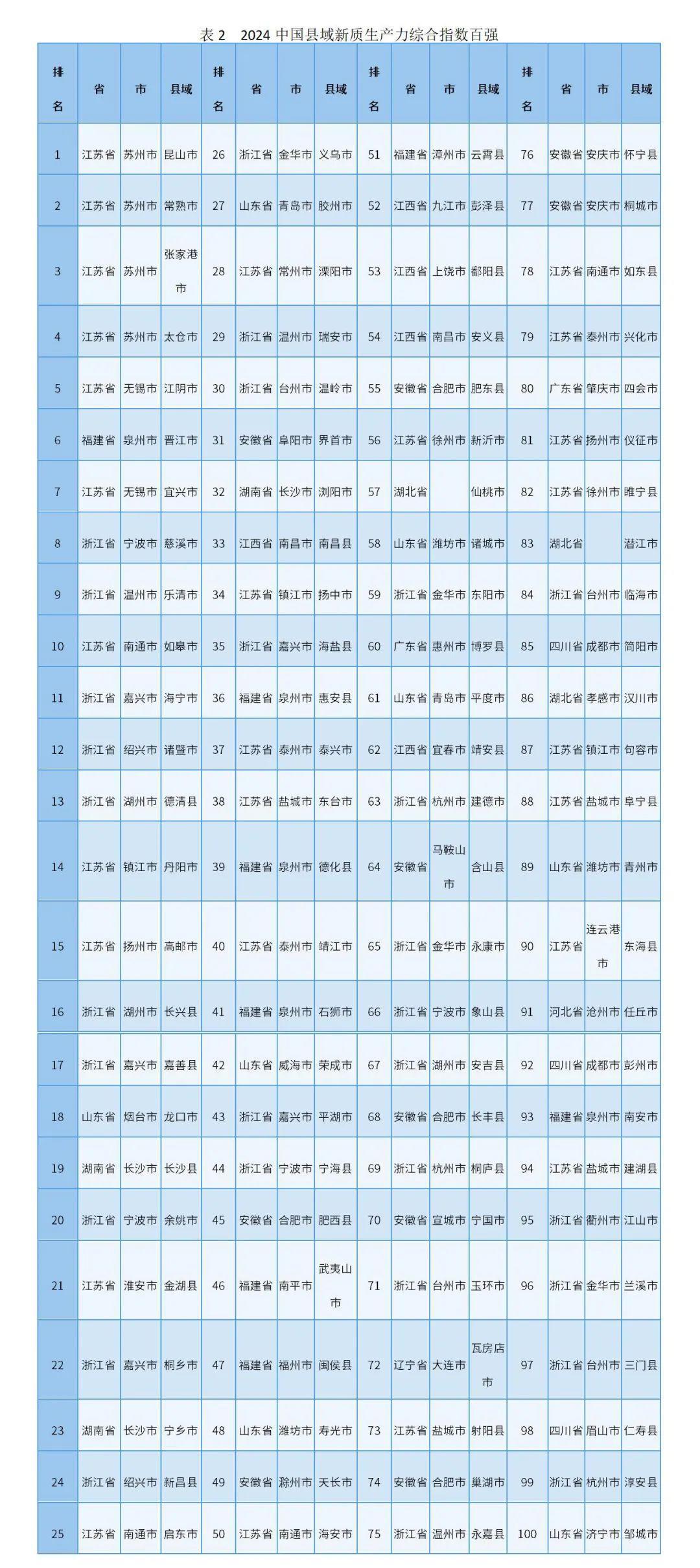 报告聚焦新质生产力高科技、高效能、高质量的3个特征,构建了包括29个具体指标的县域和市辖区新质生产力评价指标体系,对1867个县域和市辖区新质生产力发展水平进行评价,发布了“2024中国县域新质生产力综合指数百强”和“2024中国市辖区新质生产力综合指数百强”。