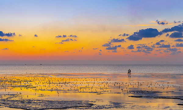 条子泥沿海滩涂湿地2019年成为国家3A级旅游景区,总面积约11.39万亩,是世界自然遗产地的重要组成部分,这里不仅有大面积滩涂湿地,更有万鸟云集的壮丽景观。涨潮时海水一望无垠,潮头鸟类成群飞舞;落潮时沙滩一马平川。这里有非物质文化遗产弶港渔号子,以及丰富的鱼类、虾类、贝壳类海产品,吸引各地游客来此观光。