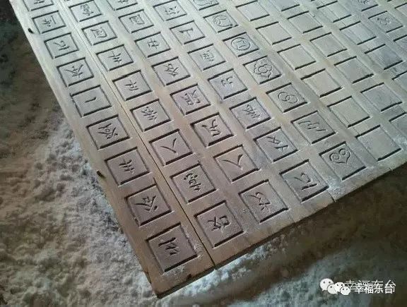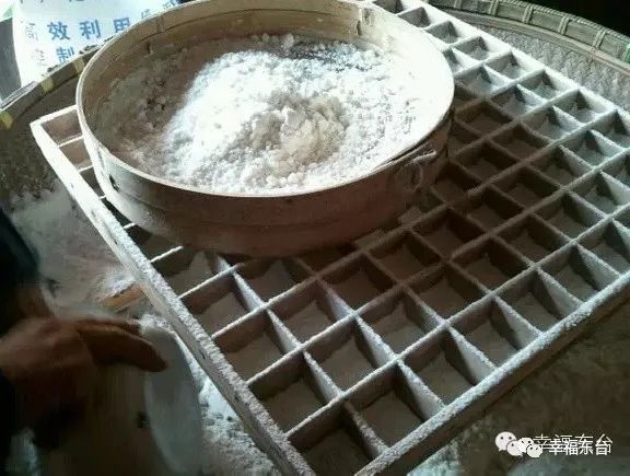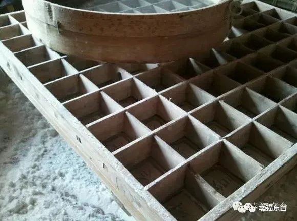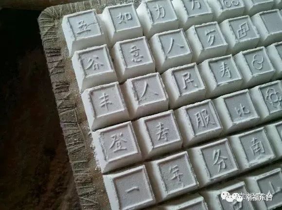 先准备好模板,上下两块盖板当中是一个分成10格或16格的盒子。上面的盖板里是印上字的,比如“福”或者“喜”,讨个口彩,出炉的糕点上有的还会点上一个红绿点,象征红红火火。
