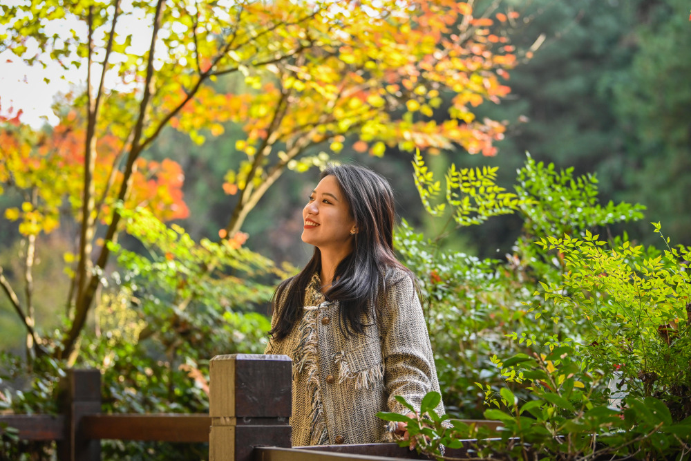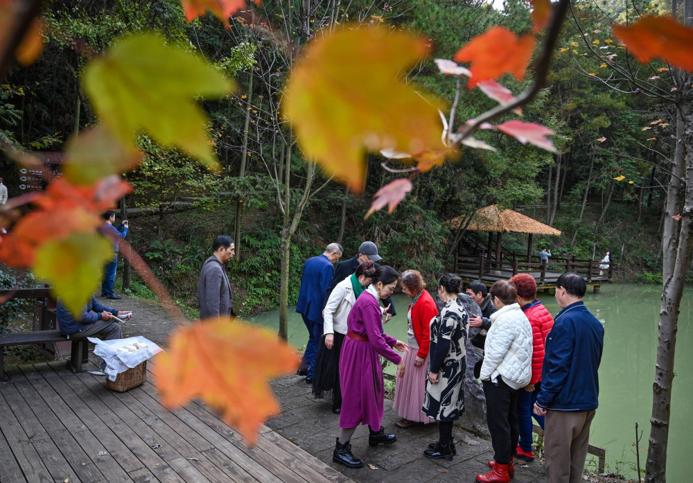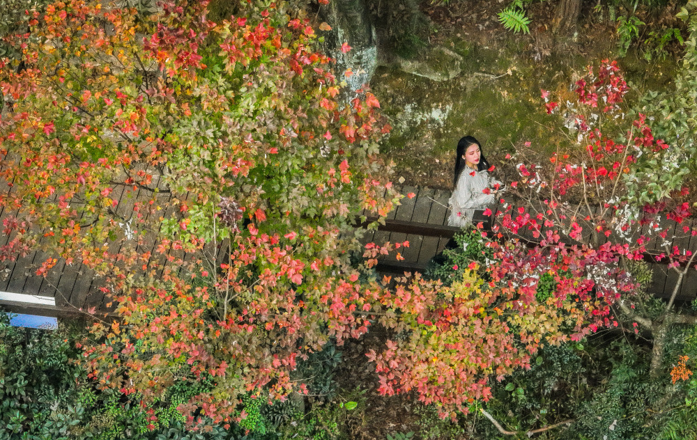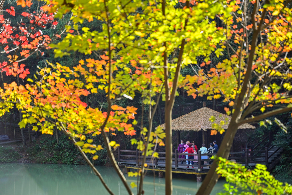 近段时间,九凤瑶池层林尽染,红黄绿相间的树叶色彩斑斓,吸引了不少市民游玩拍照。