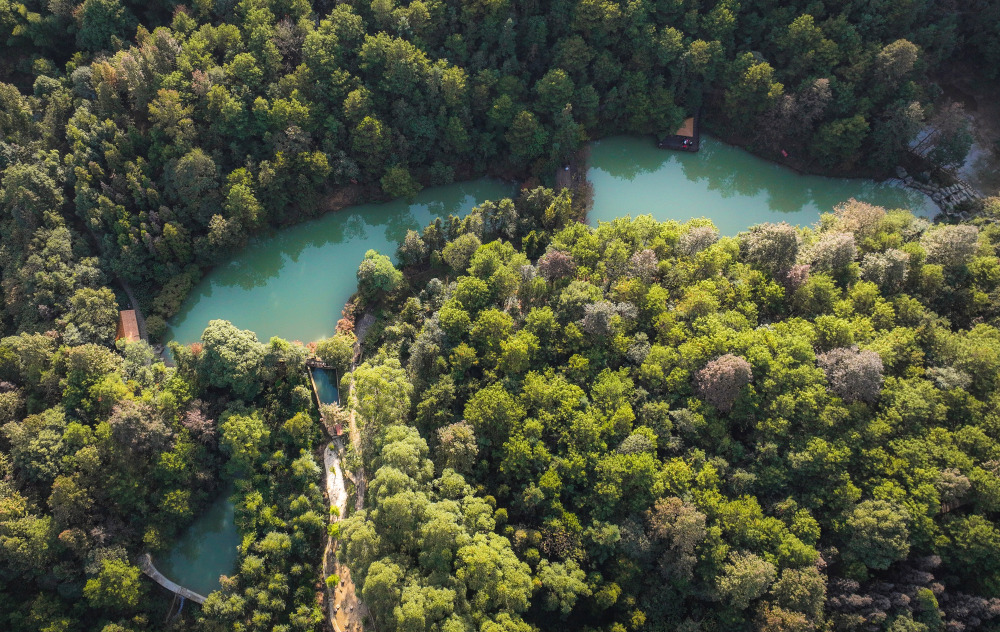 11月16日,西部(重庆)科学城金凤镇,九凤瑶池像几颗宝石镶嵌在森林之中。首席记者 龙帆 摄