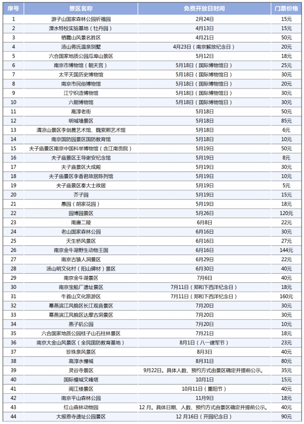 南京公布了2024年度实行政府指导价管理景区的免费开放日,44家景区,全年价值超过1300元。总要来趟南京吧~