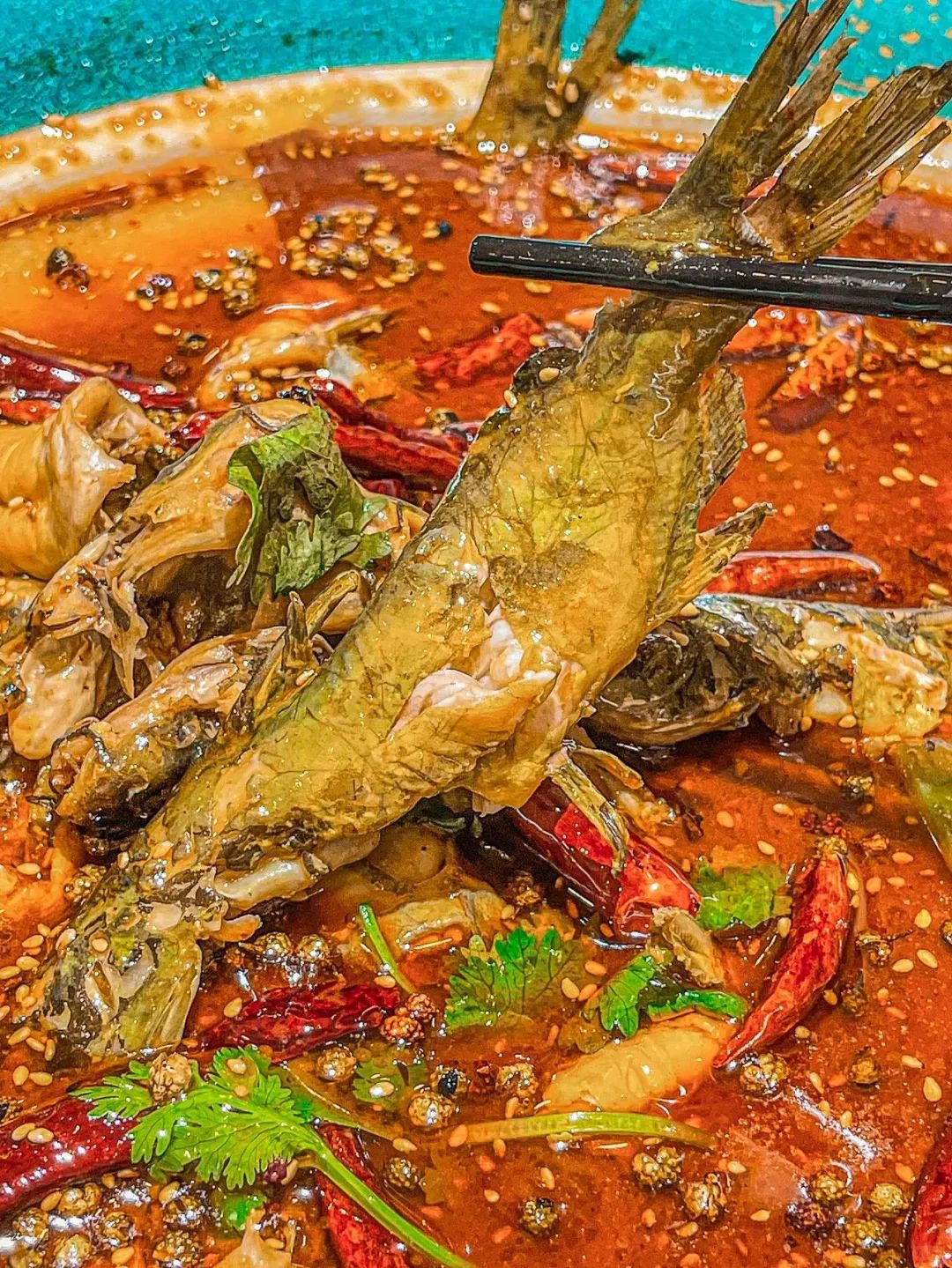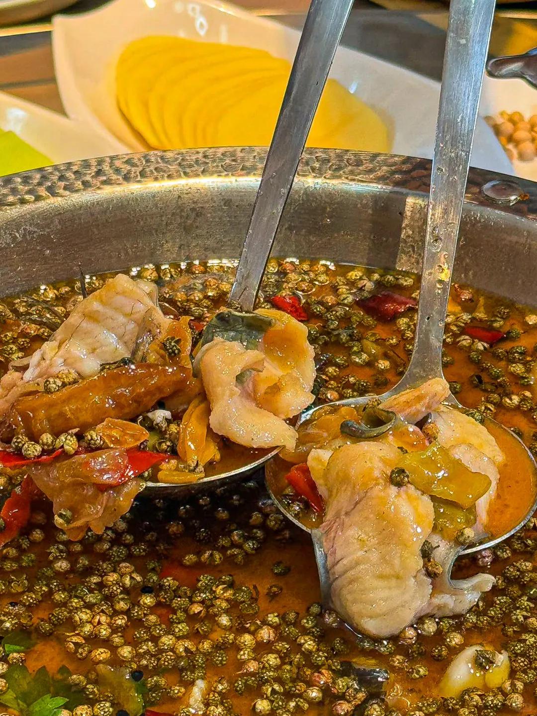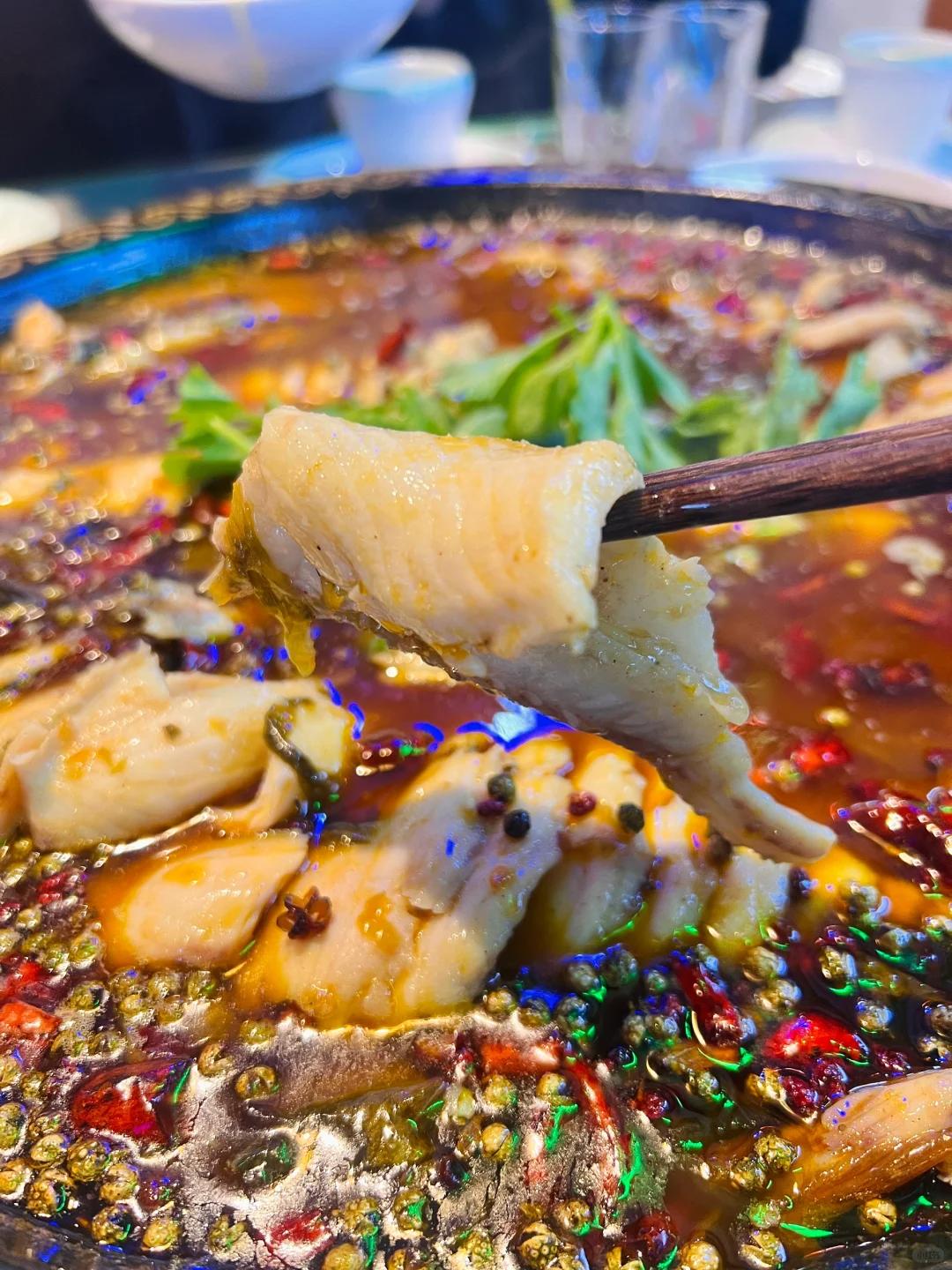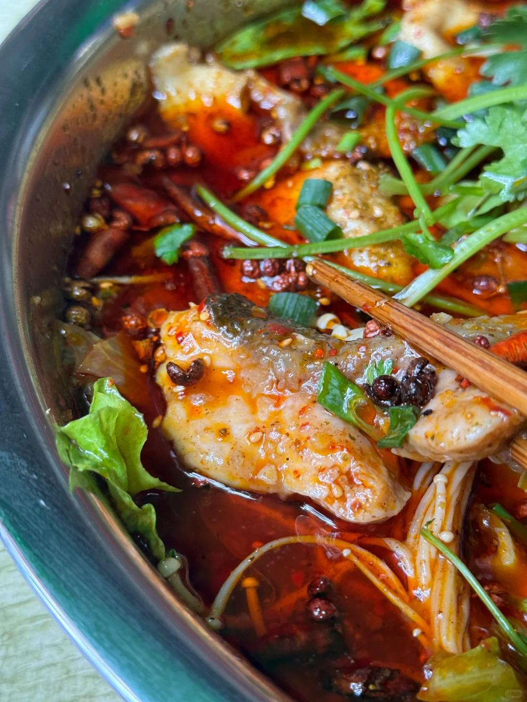 在这一片火红与椒香之中,鲜嫩的鱼肉若隐若现,鱼肉在麻辣汤中煮制后,充分吸收了汤汁的香味。