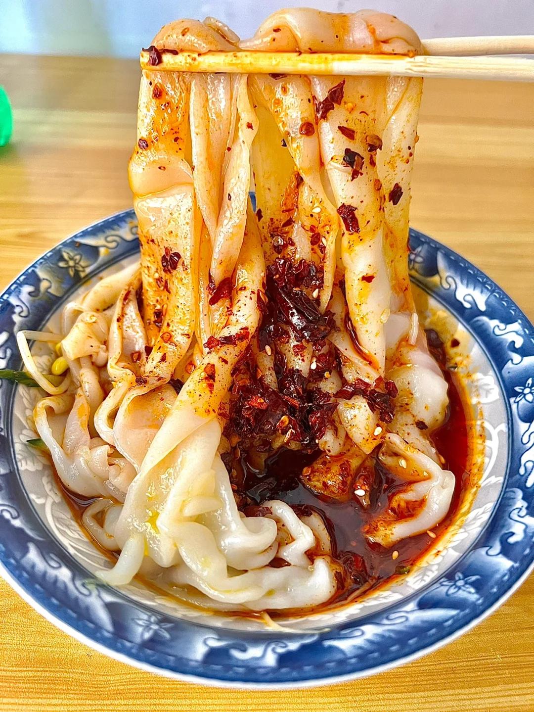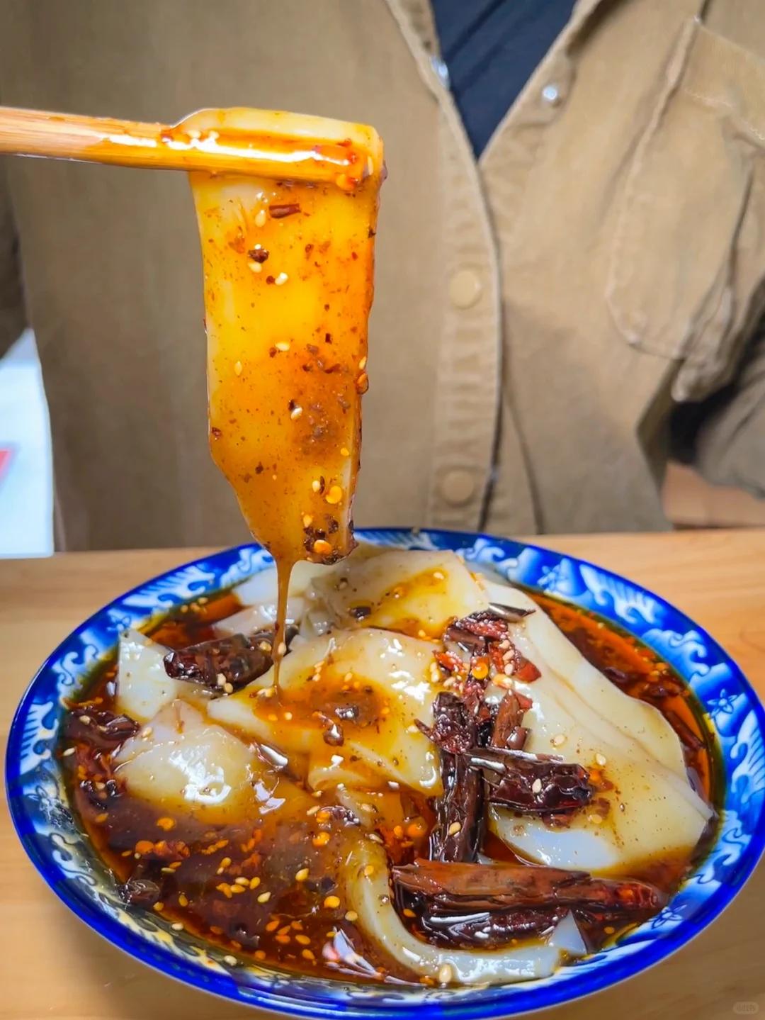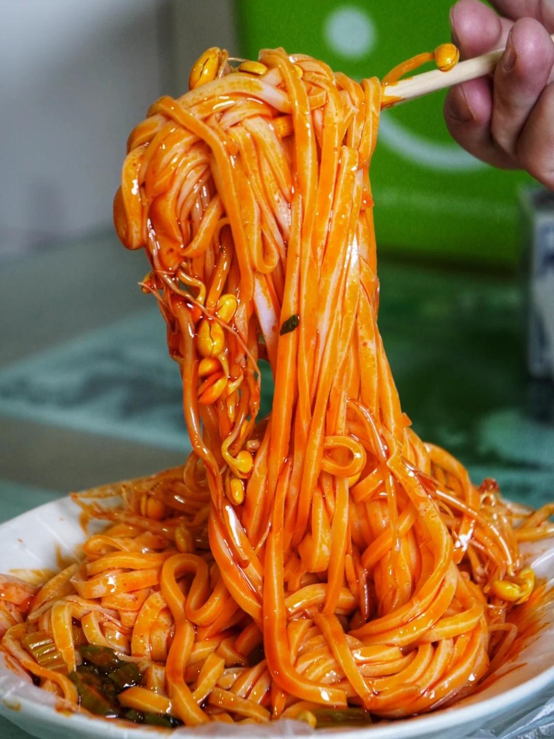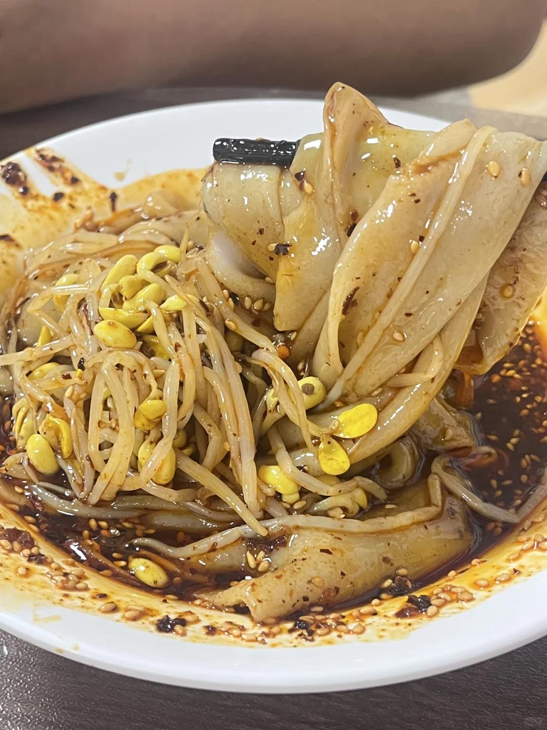 再配些黄豆芽、土豆丝、黄瓜丝,吸溜一口嗦进嘴里,面皮软糯弹韧,配菜爽脆可口,裹挟着红艳艳的辣油,又香又辣又鲜。