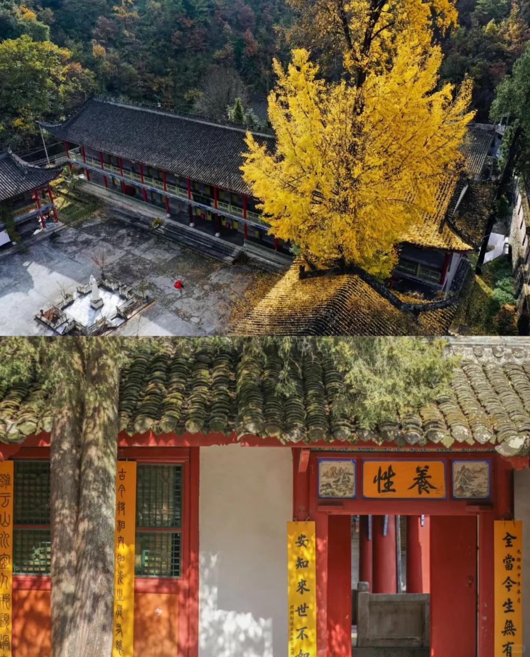 它伫立在庙前,树龄已有数百年。秋天,银杏叶由绿转黄,最终洒落一地金黄,如同铺上了一层金色的地毯。