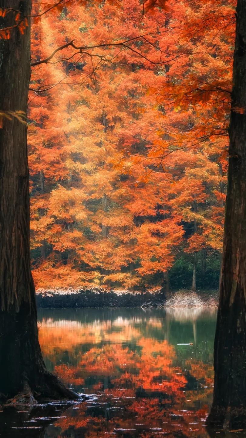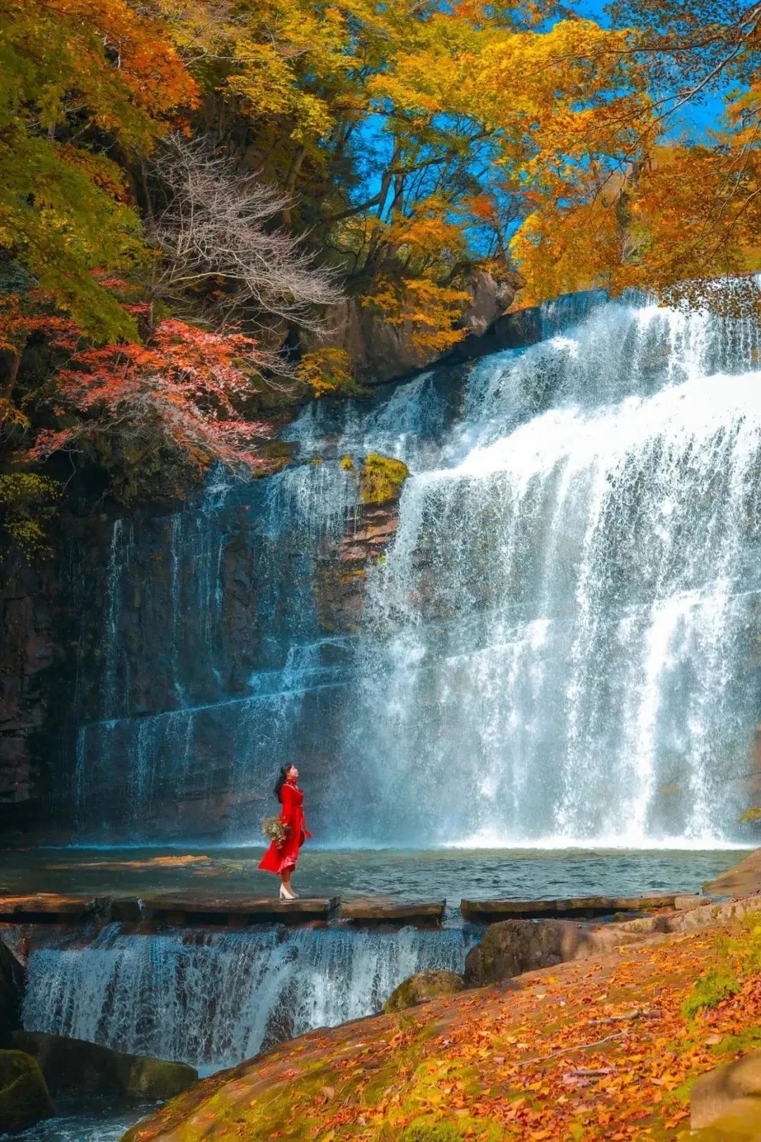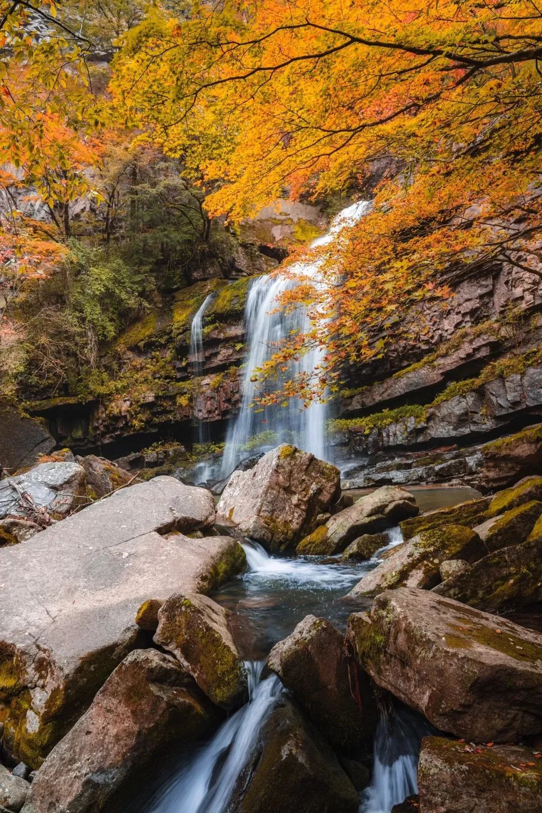 这里拥有很诗意的枫林瀑布。红叶映衬着瀑布,瀑布中倒映着红叶,真的美的太过封神了。