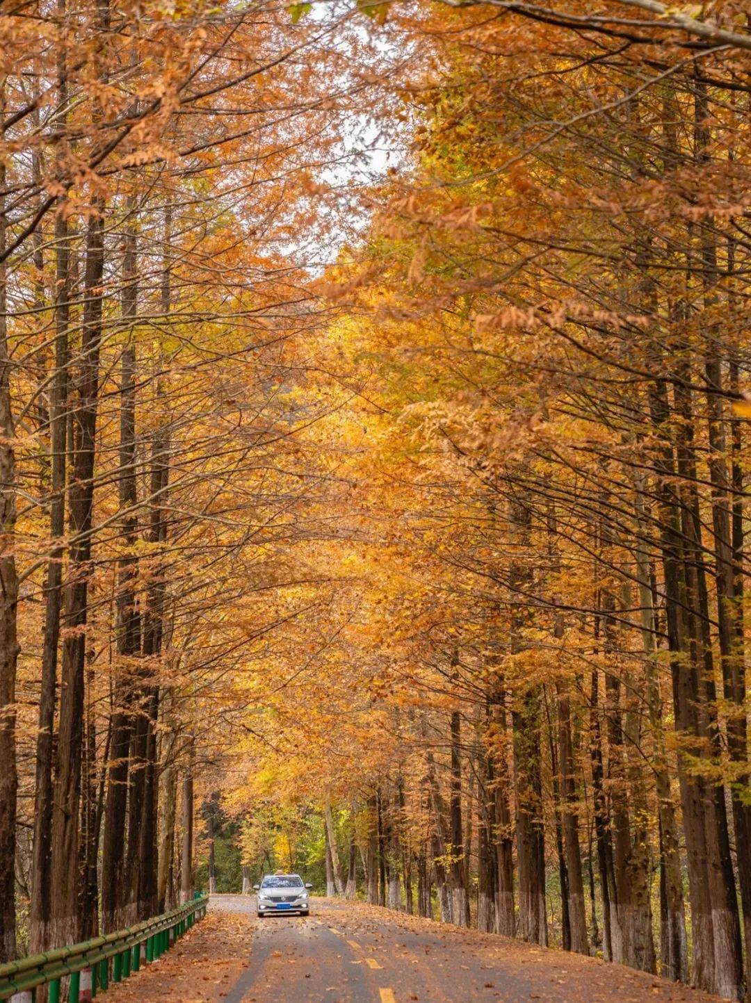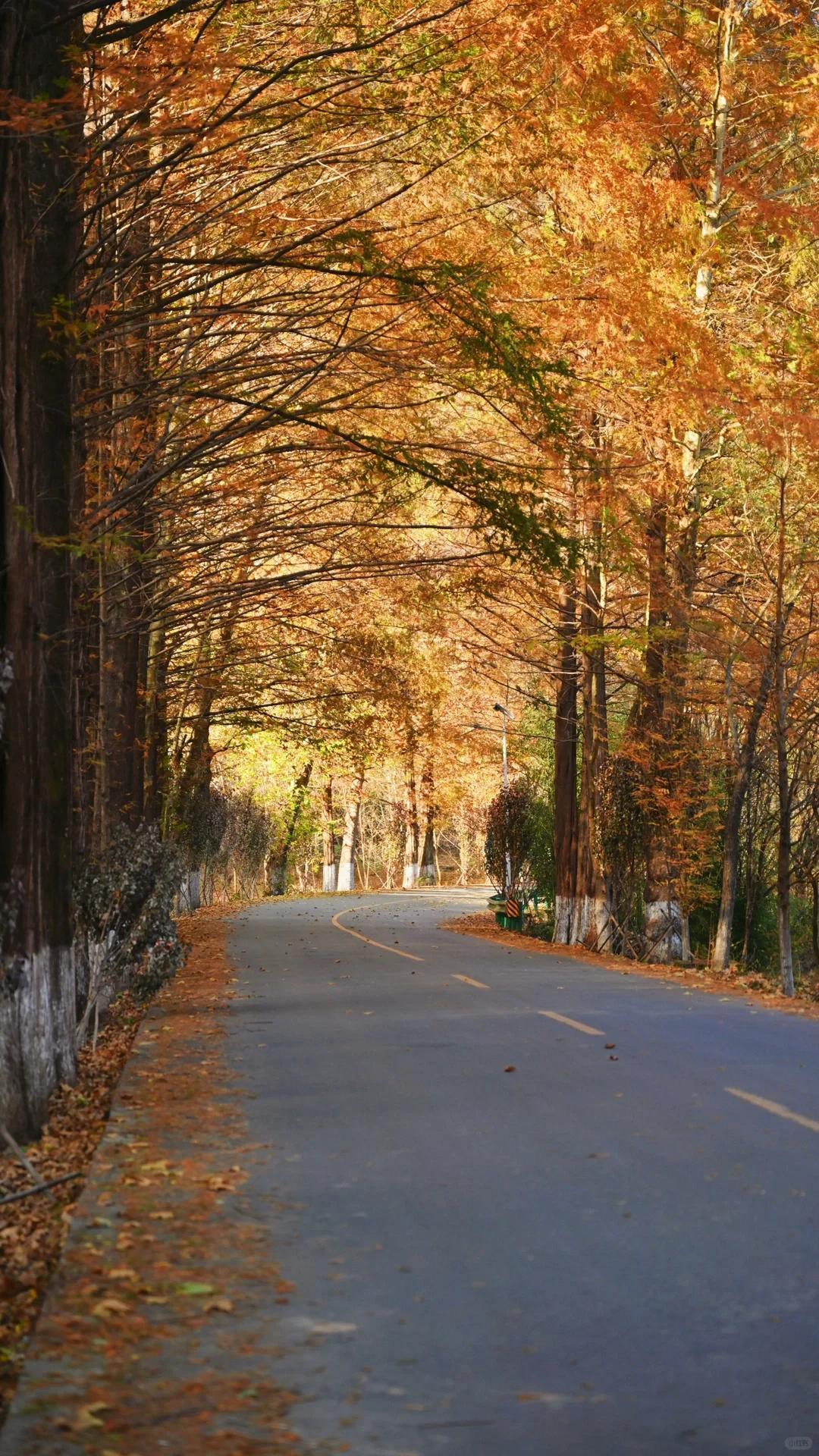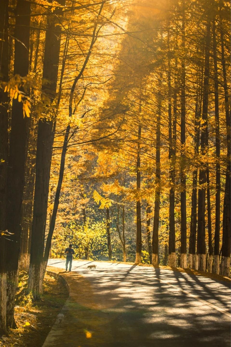 那沿路的水杉树,成为视线中两条金色的飘带,揉碎了无数阳光洒向游人的肩头!