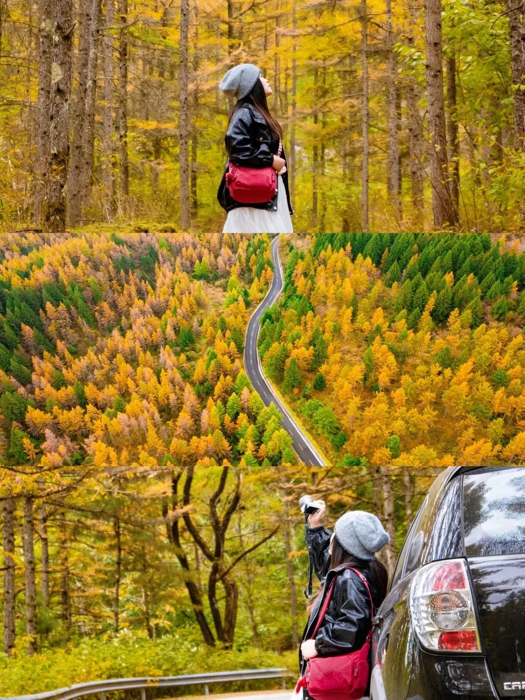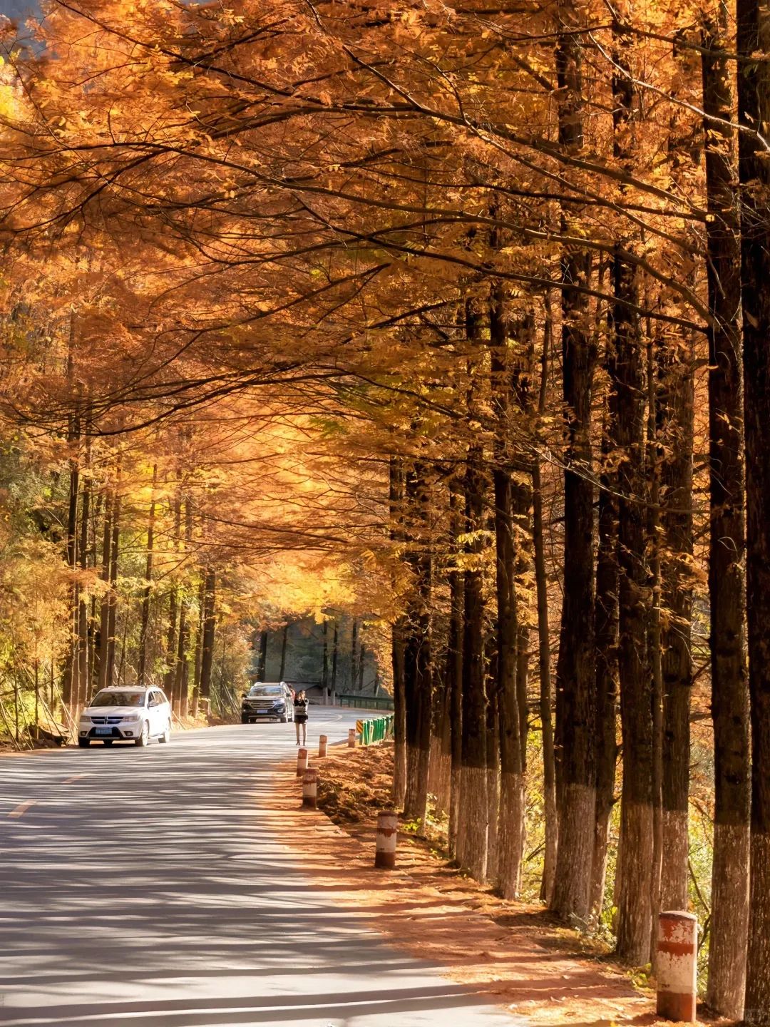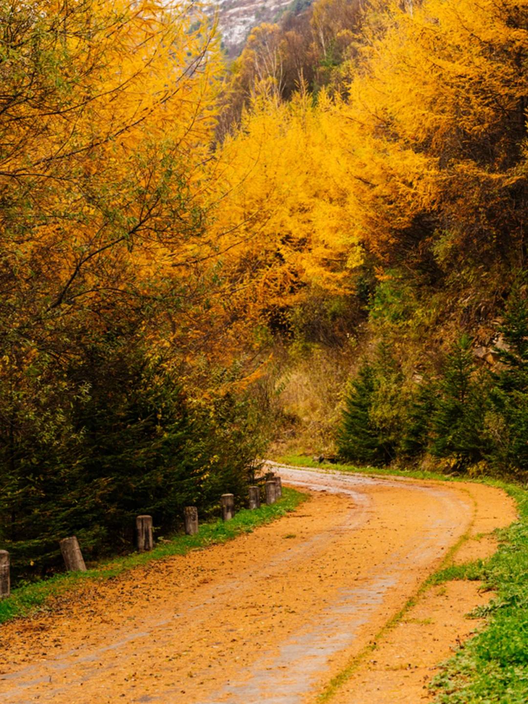 你也可以下车走走,踩着满地黄金叶,沉浸在这深秋的绚烂中,体验自驾带来的快乐!